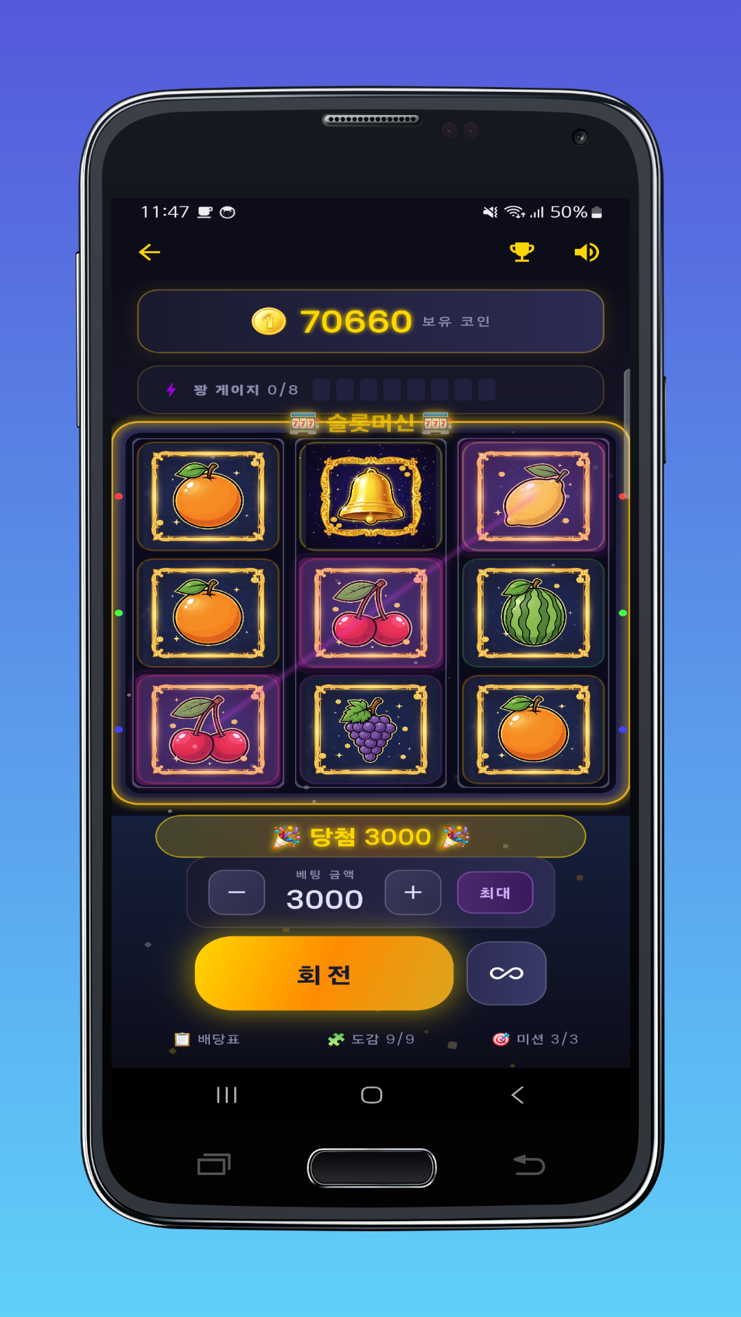 클래식 슬롯 머신의 직관적인 흐름을 유지하면서 화면 연출과 보상 타이밍을 강화했습니다.