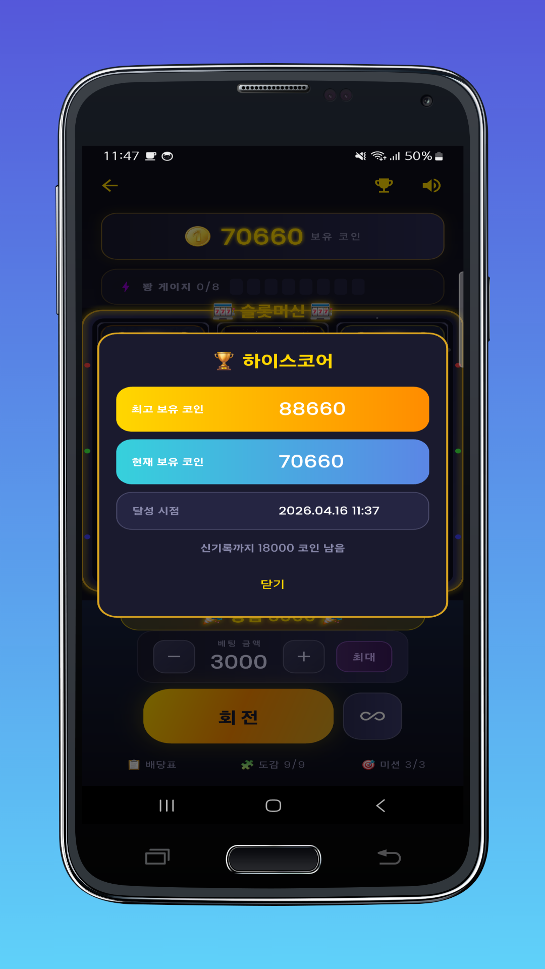 현재 보유 코인과 최고 기록을 비교하고, 등장 심볼을 도감으로 쌓아가며 장기 플레이 동기를 제공합니다.